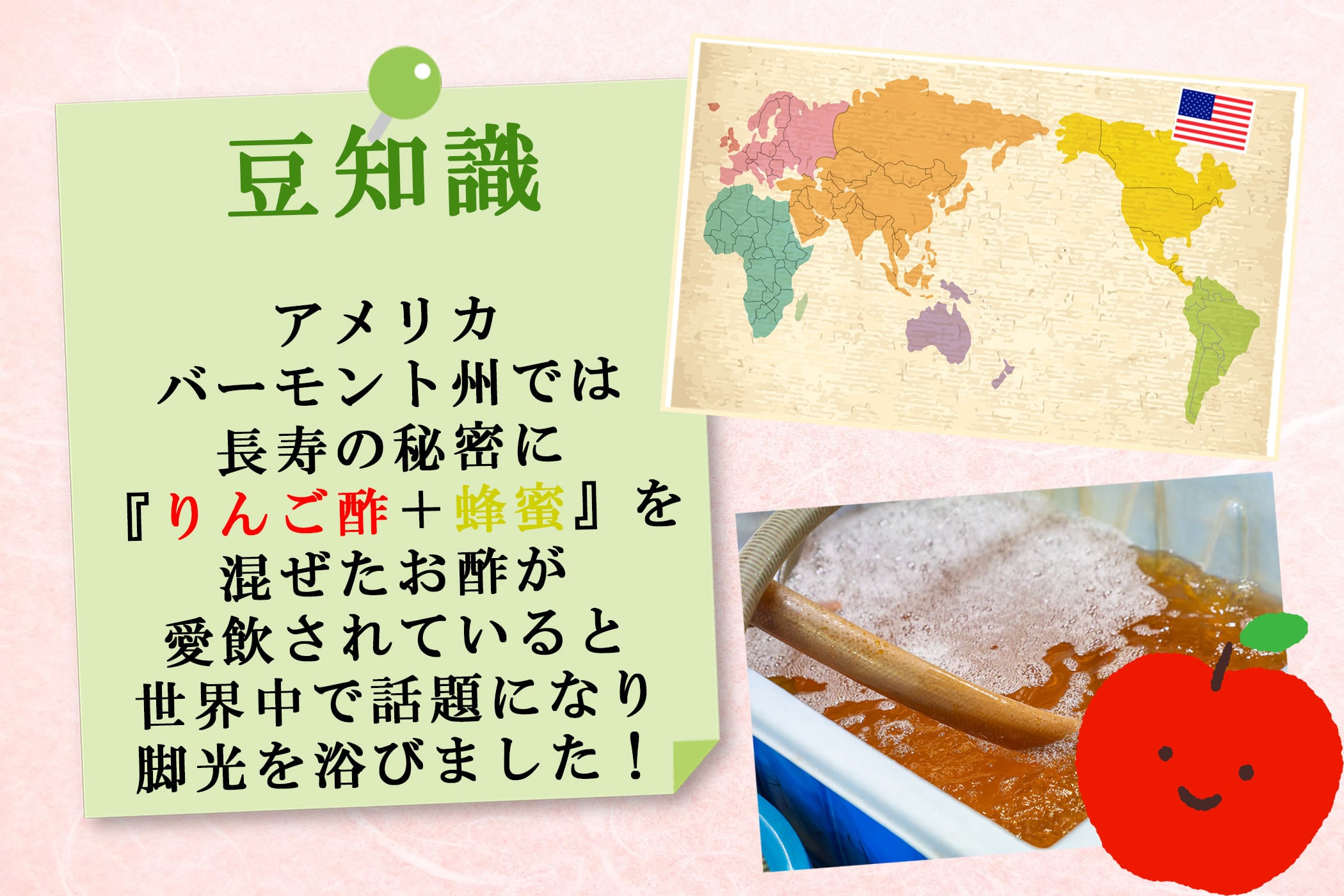 青森県と佐賀県産の生りんごを皮ごと使用する醸造酢は当時珍しく、香味豊かな味わいで雑誌や新聞、ラジオなどでも多く掲載されました。