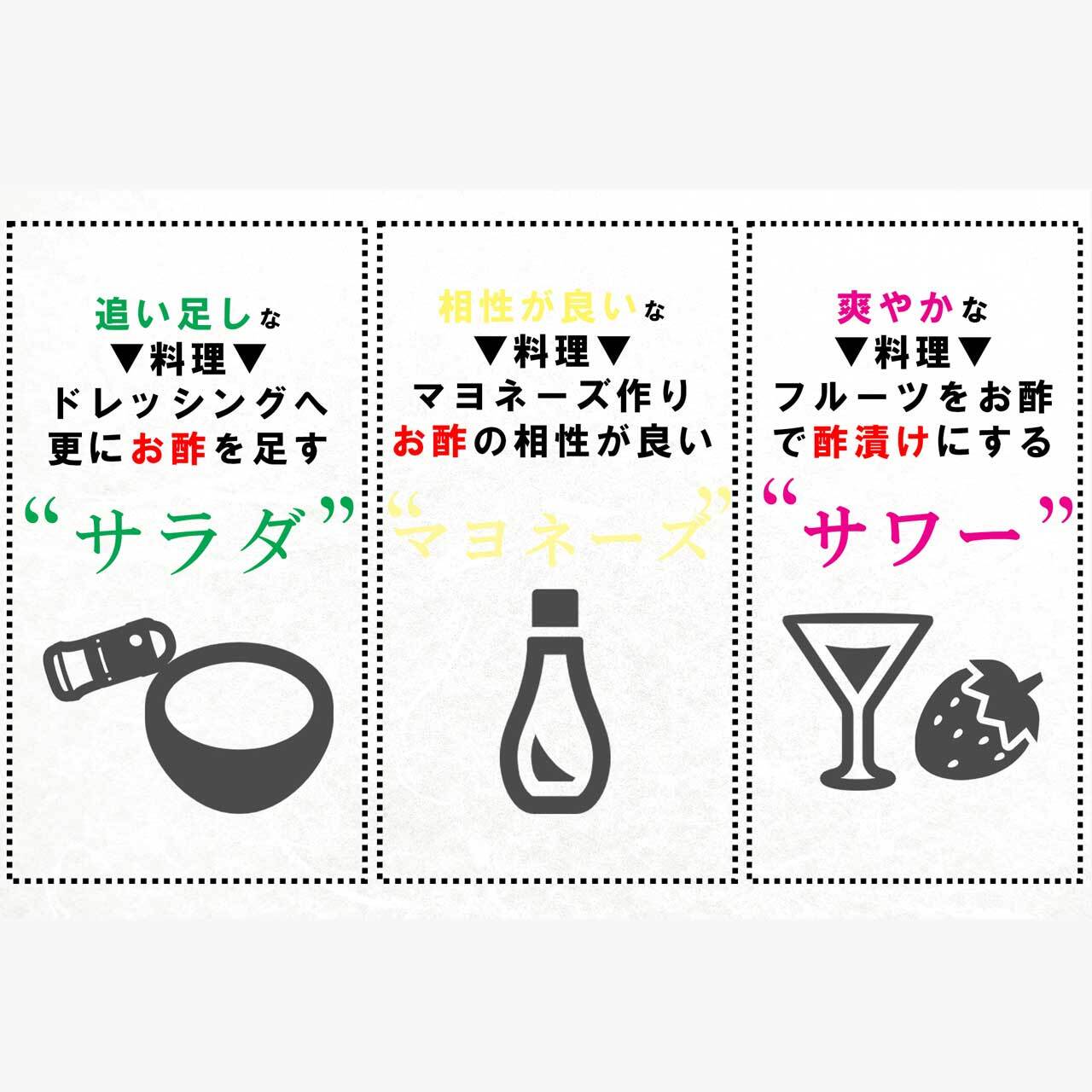 特にドレッシング、デザート、マリネにはすばらしい相性で、青梅・シソの葉・酢卵漬けにも最適です。