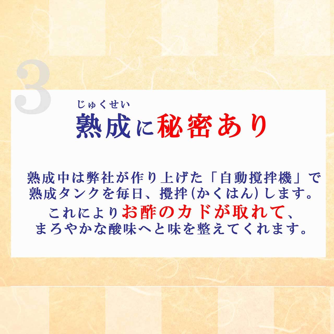 創業より受け継がれし酢酸菌でじっくりゆっくりと時間をかけて造ることで原料が溶け出し、多くの有機酸やクエン酸、りんご酸を抽出致します。
