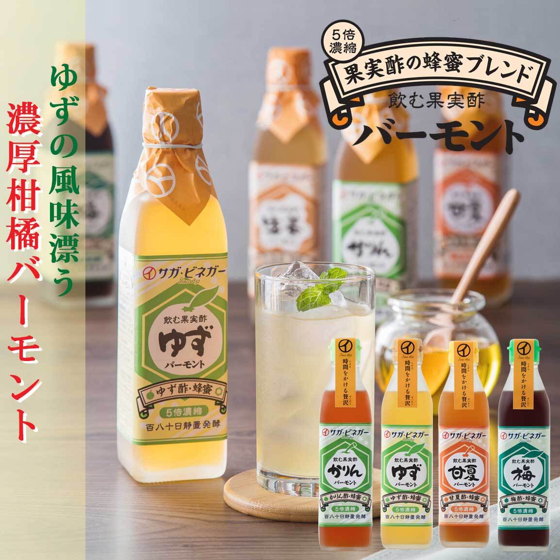 女性に人気が高く冷え性改善に最適なゆずバーモントをはじめ、漢方にも使用されるカリンをまるごと酢発酵した,かりんバーモント。佐賀の牛尾梅林で栽培された青梅を漬け込み、エキスを抽出したクエン酸豊富な梅酢バーモント、さらに、大人女性が好むほのかな苦みを感じる甘夏バーモントの四種類となっております。