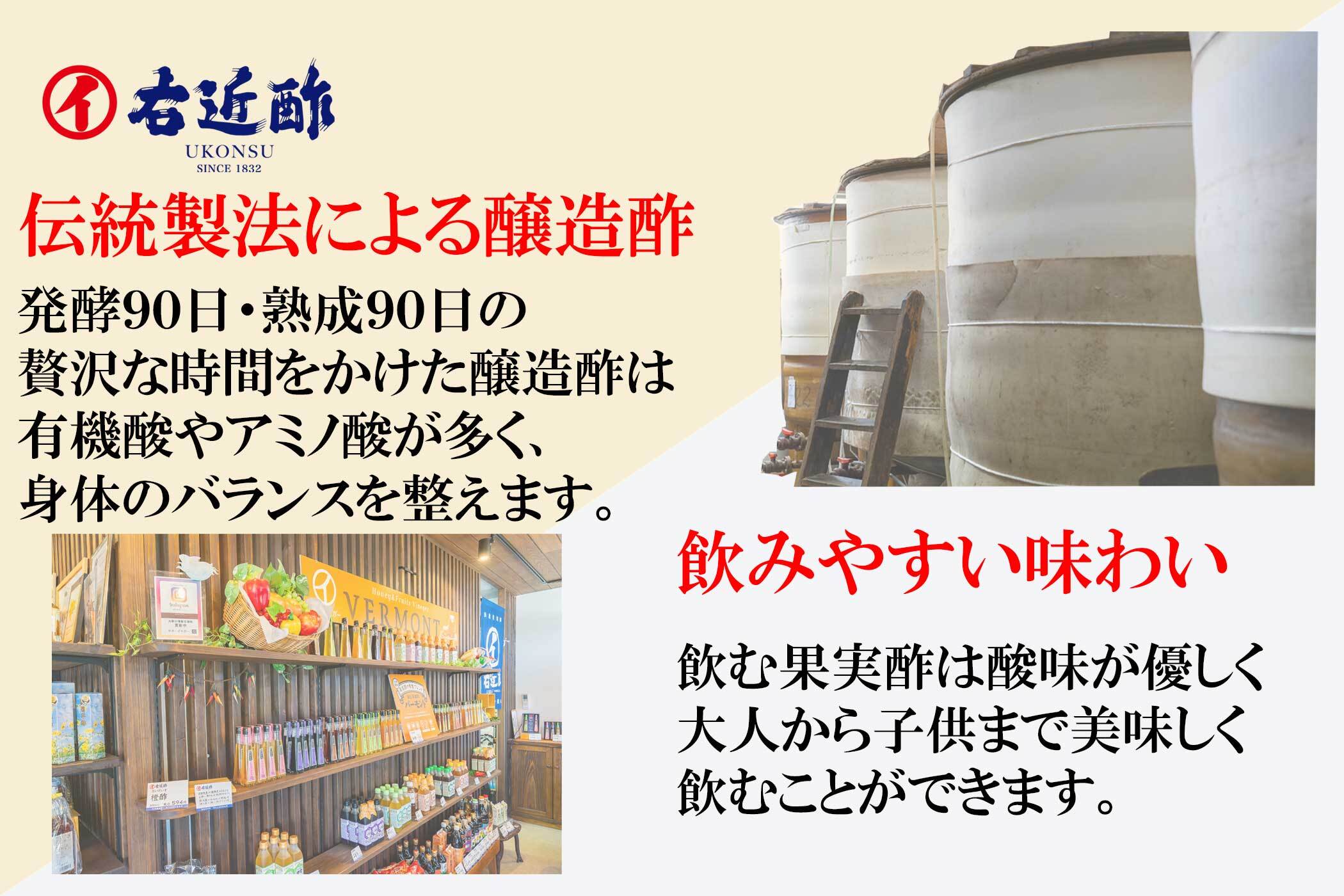 天保3年より培った製法を守り続けて190年となります。創業より培った静置発酵法は発酵に90日、熟成に90日の手間暇と時間がかかります。しかし丁寧に造りあげる醸造酢はまろやかな味わいと深い旨味を感じる醸造酢となります。